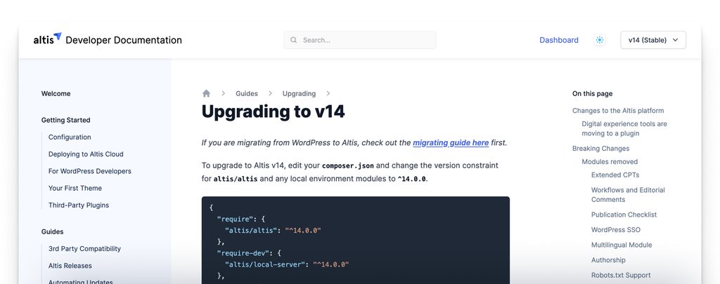To allow us to deliver more value faster, and to provide you with more control over upgrades, some modules and plugins have been unbundled from the platform with the Altis Cloud v14 release. These are still available separately; please see our upgrading guide for more information on which modules we removed, and how to use their standalone versions.