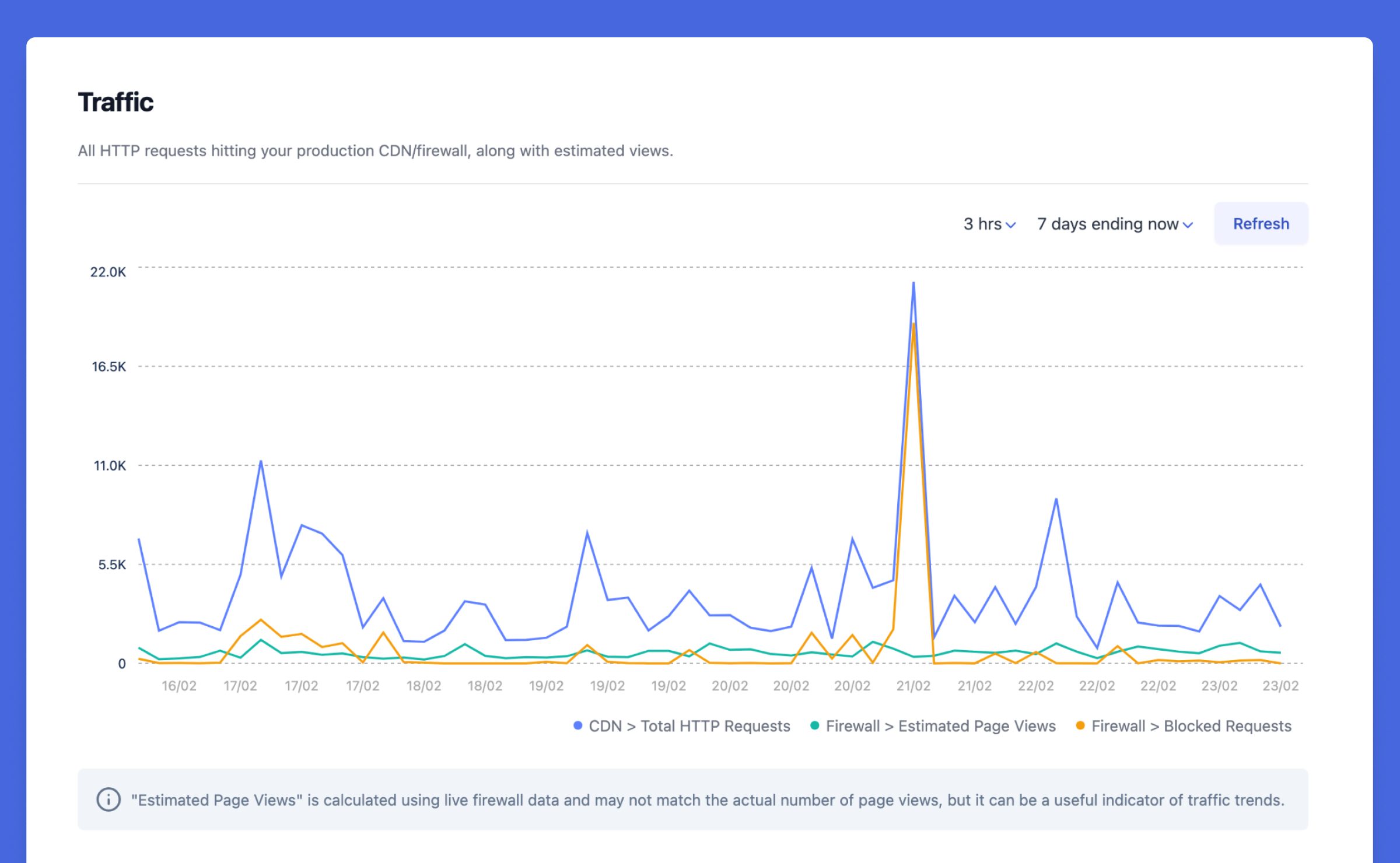 With version 26, we’re launching a brand new traffic view in the Altis Dashboard, giving you better visibility into your requests. This view provides a quick view of your total HTTP requests and those being blocked by the firewall, as well as an estimate of your page views.