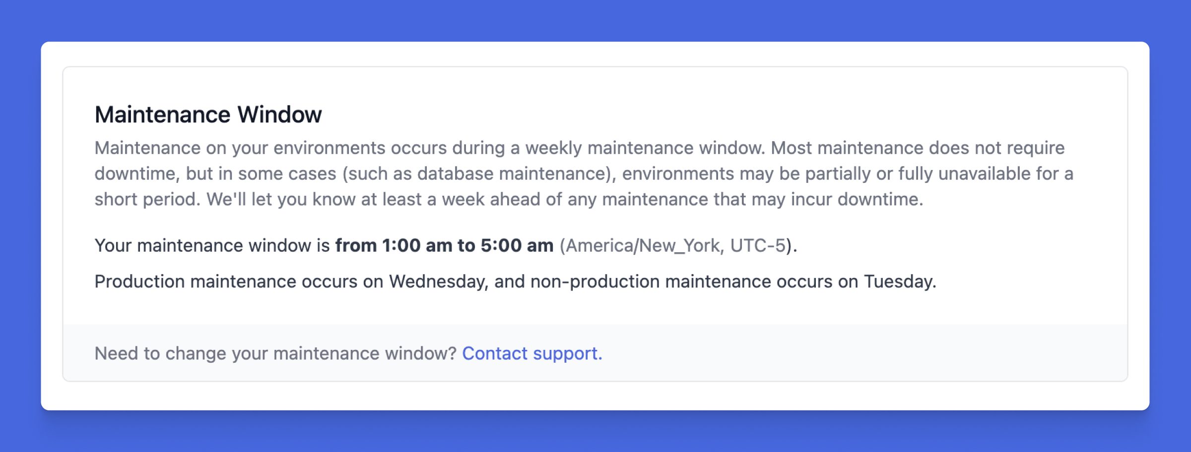 You can now view your weekly maintenance window on your instance Settings page, including the production and non-production days. Plus, you can see and adjust who receives email notifications for maintenance, service updates, and incidents right from this screen.