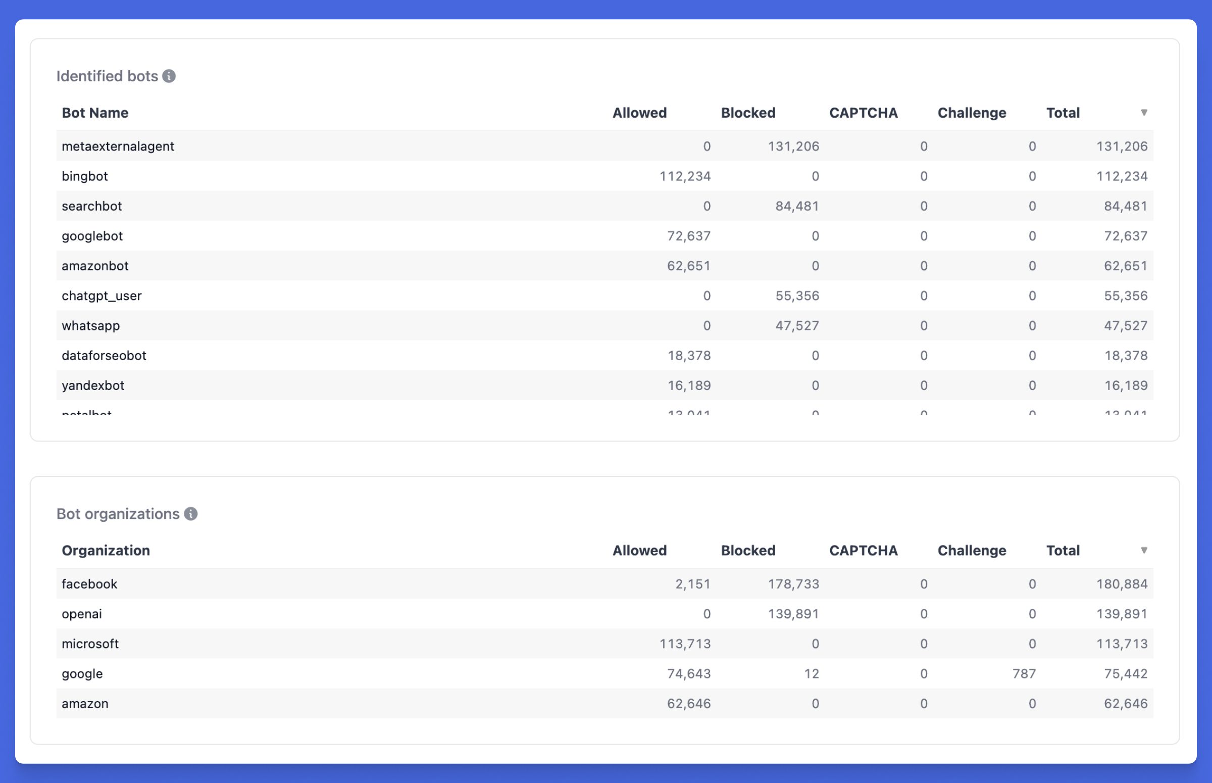 For customers with our new Advanced Traffic Management add-on, the traffic view will show even more detailed data on individual bots and their organization, as well as controls to block this traffic outright or apply automated challenges or CAPTCHAs to it.
