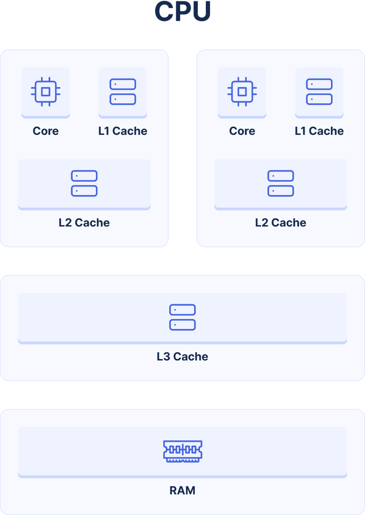 When CPUs began to increase in power (vertical scaling), they needed to introduce a caching layer to ensure data was always available when needed. With multi-core CPUs, the idea of private vs shared caching arose, where each core could have its own (very close, very fast) caching layer, which coordinated with the (further away, but still fast) shared cache. In modern CPUs, each core has its own “L2” cache, which builds on top of a shared “L3” cache (the “L1” cache is private, and is like our in-memory, request-lifetime cache in WordPress).